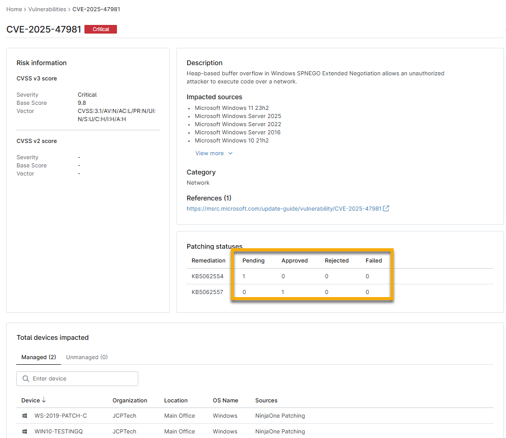 Questo articolo illustra come visualizzare i dati sulle vulnerabilità delle patch all'interno di NinjaOne e identificare le azioni consigliate.