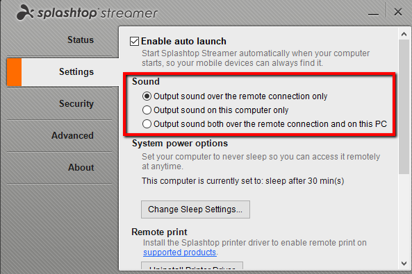- R: Splashtop supporta la stampa da un dispositivo remoto a una o più stampanti sul dispositivo che avvia la connessione. Per utilizzare la funzione, apri il programma di installazione di Splashtop Streamer e installa il driver di stampa remota dalle Impostazioni, sul dispositivo ricevente. Potrebbe essere necessario riavviare il dispositivo dopo l'installazione del driver di stampa da remoto. Quindi, per stampare dal driver di stampa remota, avvia una stampa dal dispositivo ricevente e seleziona la stampante Splashtop. Si aprirà una finestra sul dispositivo di avvio e verrà richiesto all'utente di selezionare la stampante su cui desidera stampare. Splashtop fornisce qui ulteriori informazioni a riguardo.