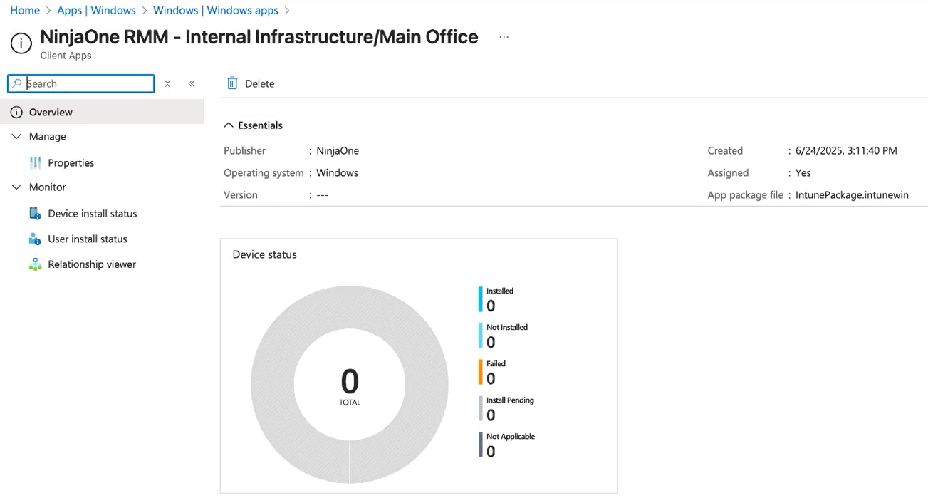 Se si elimina l'applicazione di distribuzione dell'agente NinjaOne da Microsoft Intune, NinjaOne non rileverà questa modifica e continuerà a sincronizzarsi con Microsoft Intune.