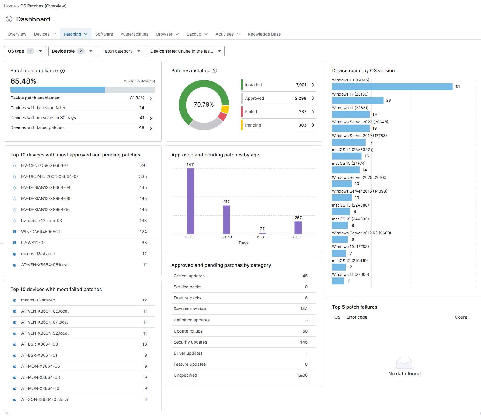 | Primi 5 con patch non riuscite | Genera un elenco dei sistemi operativi con il maggior numero di patch non riuscite; questo widget mostra i codici di errore specifici. Ulteriori informazioni su questi errori sono disponibili nella scheda Patching del dashboard alla voce OS → Failed. |