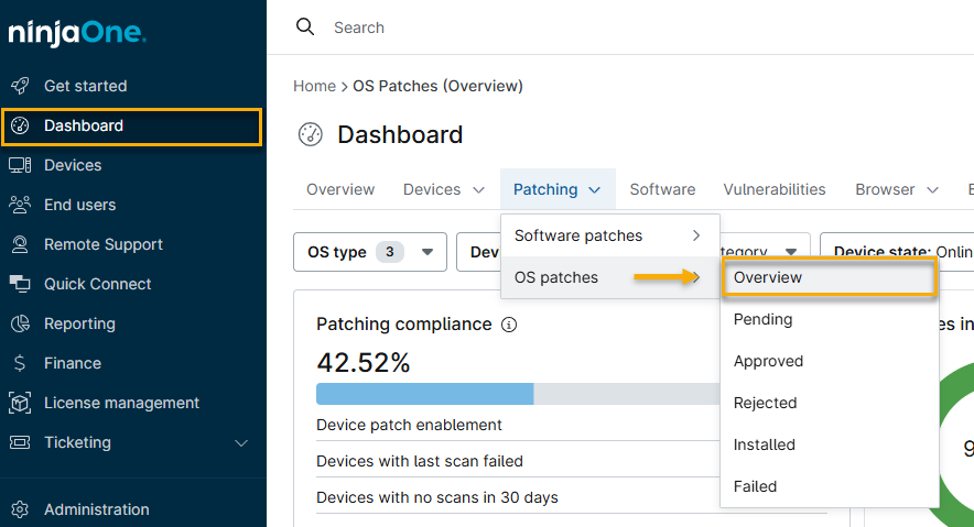 In NinjaOne, navigare in Dashboard → Patching, quindi selezionare Patch del software o patch del sistema operativo → Panoramica.