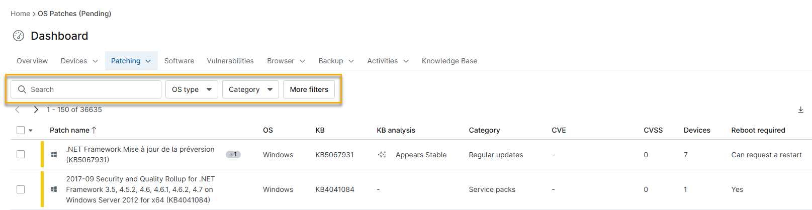 Utilizza la barra di ricerca sopra ciascun elenco di patch per trovare una patch in base al nome, al valore CVE (Common Vulnerability and Exposure), al numero della documentazione della Microsoft Knowledge Base (KB), al numero di identificazione della patch o alla categoria.