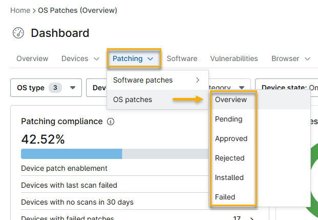 I filtri si trovano nel menu a discesa Patching e sopra i widget dei dashboard Patching e tutte le opzioni (tranne Stato dispositivo) sono selezionate per impostazione predefinita.