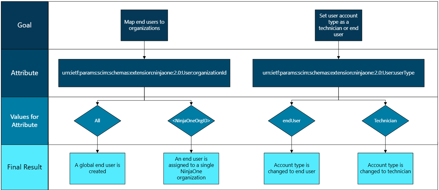 Figura 1: Obiettivo e risultato finale per gli attributi dell'account utente NinjaOne "customappsso" e i loro valori accettati (fare clic per ingrandire)