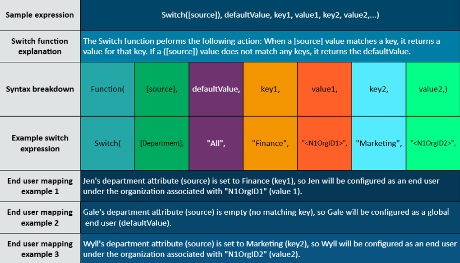 Sebbene gli esempi illustrati nelle sezioni precedenti di questo articolo siano metodi comuni per mappare gli account, esistono molti altri attributi utente rilevanti che è possibile utilizzare per mappare gli utenti finali all'organizzazione applicabile in NinjaOne. Se si dispone di un attributo che può essere utilizzato per mappare gli account degli utenti finali, è possibile utilizzare la funzione Switch in un'espressione, ad esempio.