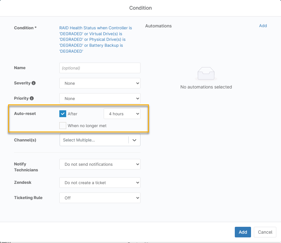 Alcune condizioni, ad esempio la condizione Dispositivo inattivo, possono avvisare i tecnici quando la condizione viene reimpostata. Spunta la casella Notifica al momento della reimpostazione per attivare questa opzione.