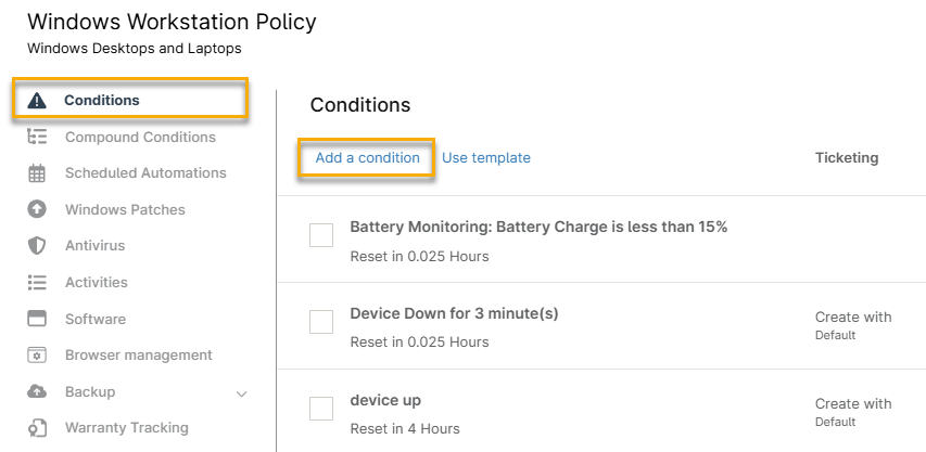 Per configurare le condizioni monitorate in NinjaOne, segui questi passaggi: