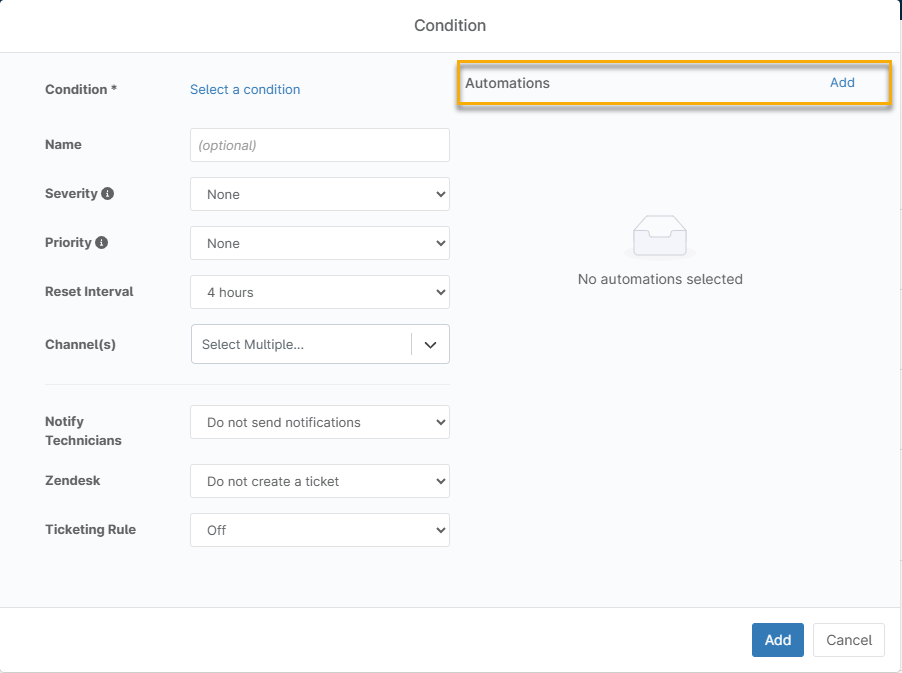 Se la condizione si attiva, puoi aggiungere uno script da installare o eseguire un'applicazione per correggere il problema. Clicca su Aggiungi nella sezione Automazione della finestra di modifica della Condizione. Questa azione visualizza un elenco di tutti gli script nativi e di quelli aggiunti tramite la libreria di automazione NinjaOne.
