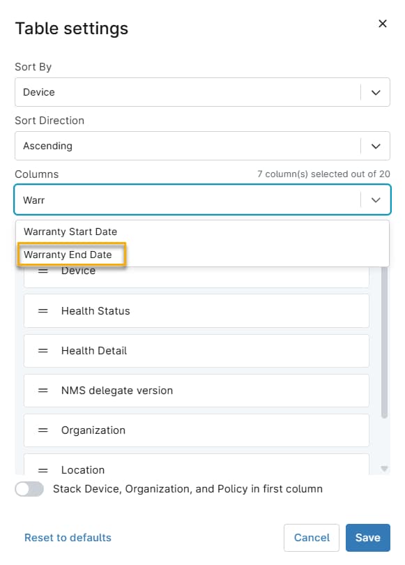 - Nel menu Colonne, iniziare a digitare Data di scadenza della garanzia, quindi fare clic sulla voce quando viene completata automaticamente per aggiungerla alla pila delle colonne. È possibile regolare la posizione della colonna nella griglia di ricerca facendo clic sulla maniglia di spostamento nella pila delle colonne e trascinandola verso l'alto o verso il basso.