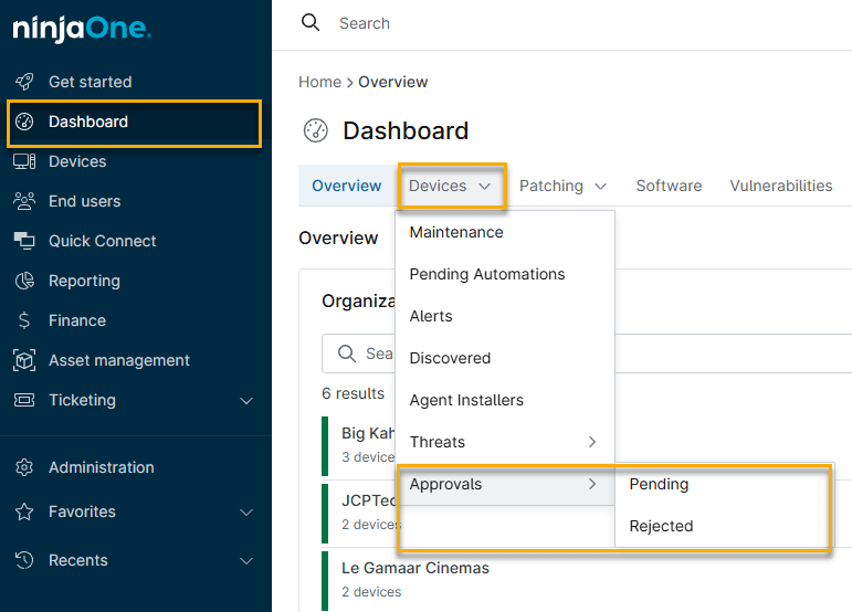 - In NinjaOne, fare clic su Dashboard nel menu di navigazione, quindi posizionare il cursore sulla scheda Dispositivi e selezionare Approvazioni dal menu a discesa.