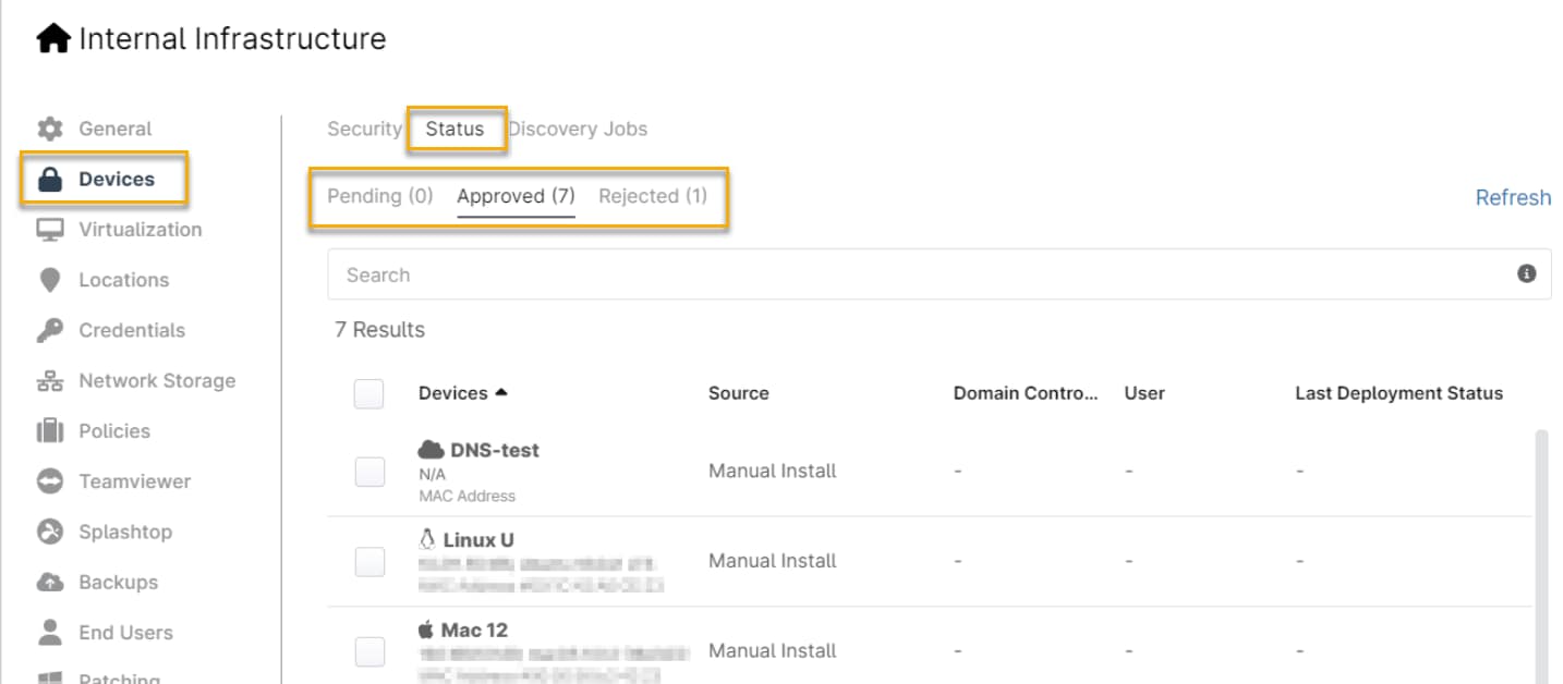 - Fare clic su Dispositivi e aprire la scheda Stato. Il sistema mostrerà un elenco di dispositivi nelle categorie In attesa, Approvati e Rifiutati.