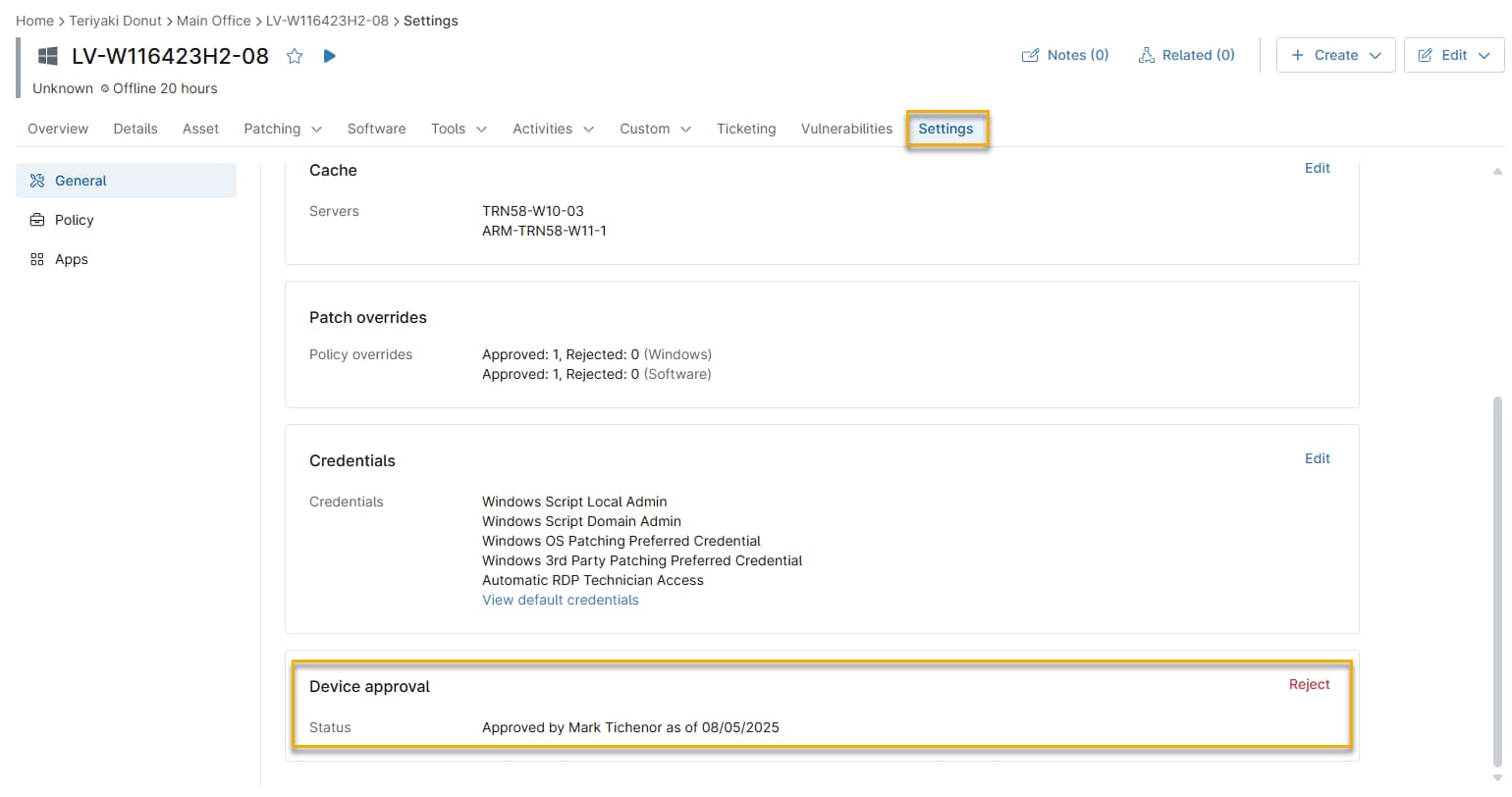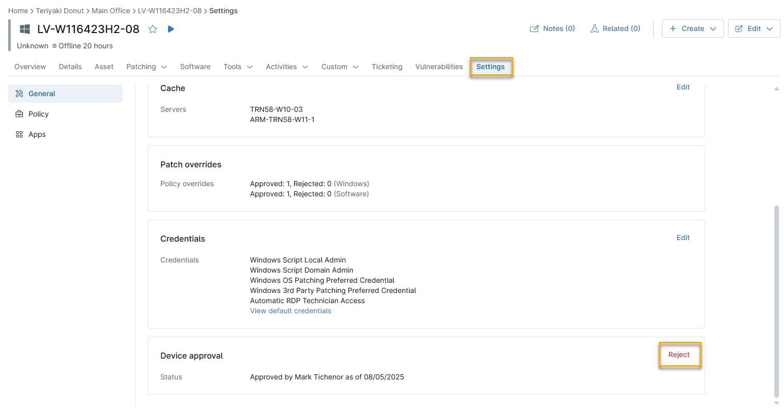 È inoltre possibile modificare lo stato di approvazione di un dispositivo dalla scheda Impostazioni.