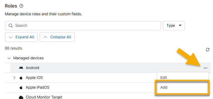 - Per i dispositivi non gestiti, è possibile continuare a espandere i ruoli del dispositivo esistenti e creare sottotipi facendo clic sull'icona della parentesi angolare (> ). I sottotipi ereditano le proprietà definite per il tipo di dispositivo.