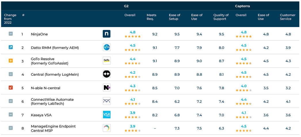 Niet alleen in de grafiek hieronder, maar ook rechtstreeks op G2 hier kunt u een vergelijking van de beste RMM-oplossingen bekijken.